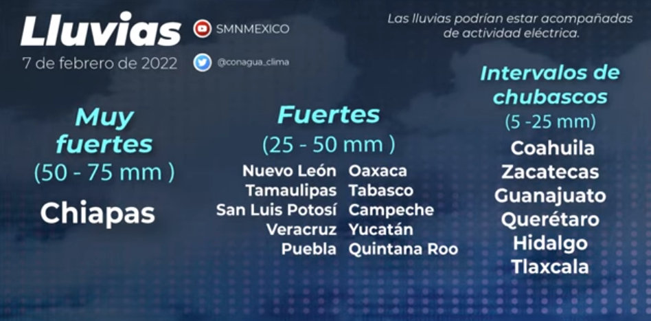 Heladas para la madrugada del martes: Baja California, Sonora, Chihuahua, Coahuila, Nuevo León, Tamaulipas, San Luis Potosí, Zacatecas, Durango, Sinaloa, Aguascalientes, Jalisco, Michoacán, Guanajuato, Querétaro, Hidalgo, Veracruz, Puebla, Tlaxcala, Estado de México, Ciudad de México y Morelos.